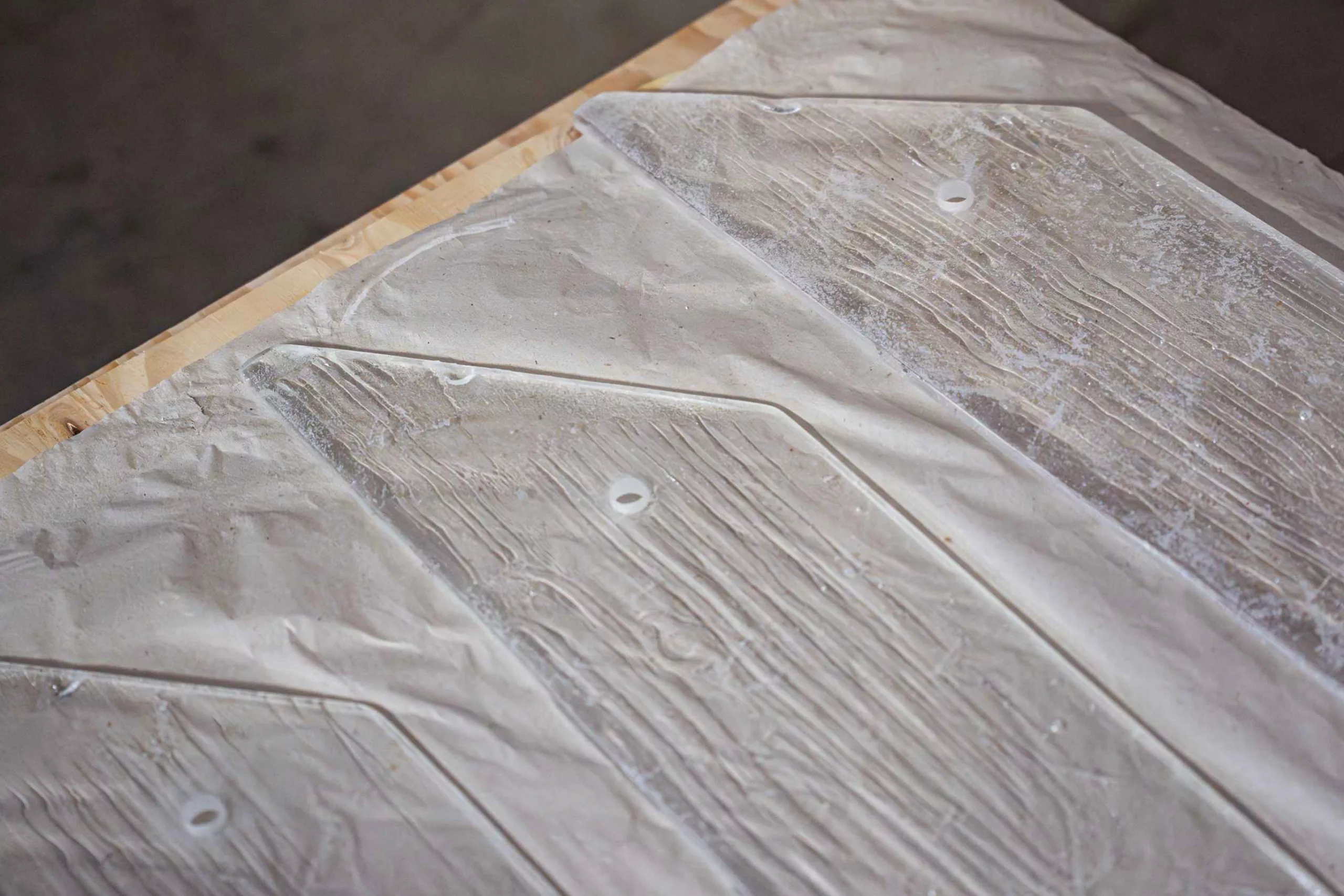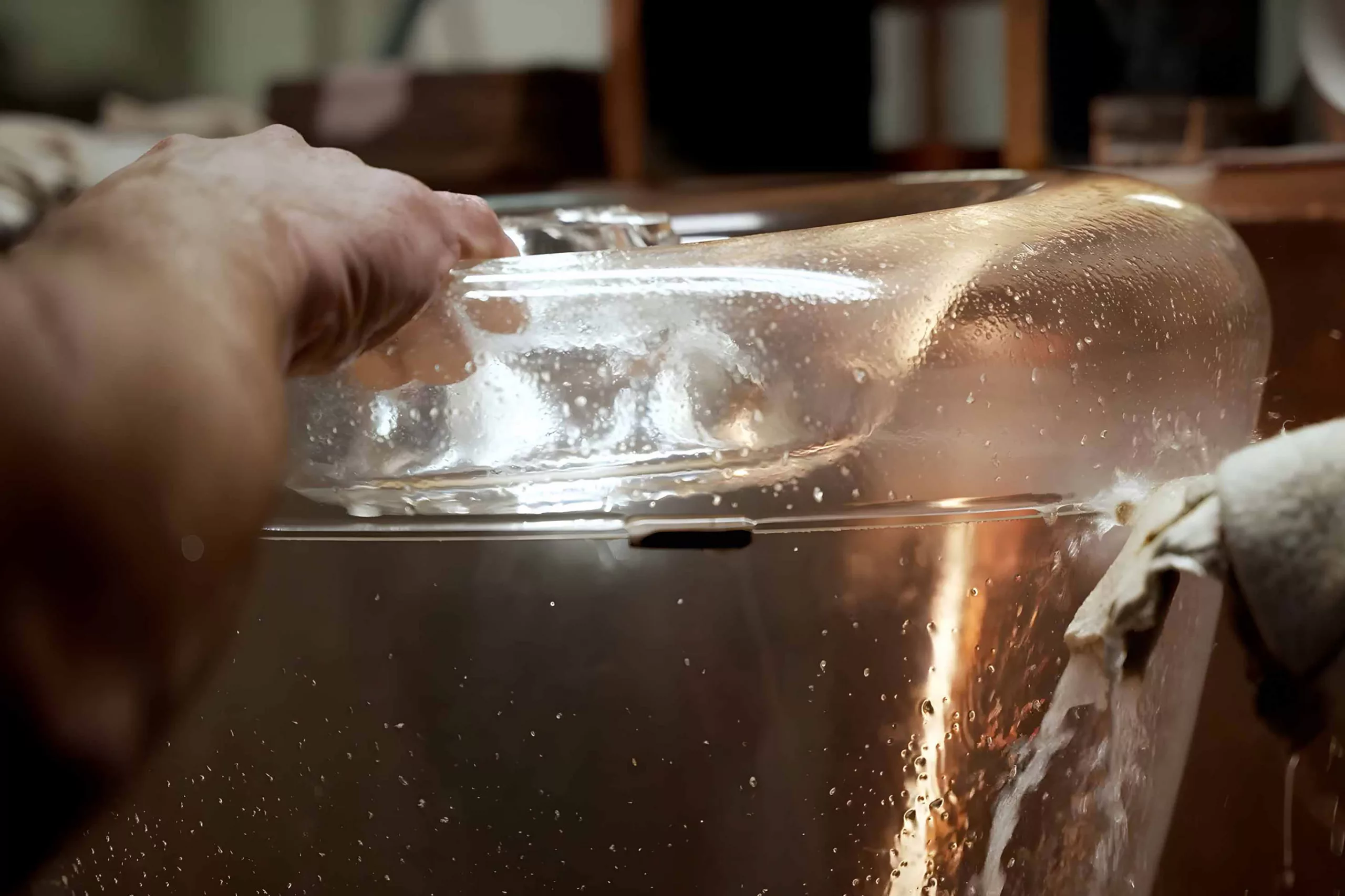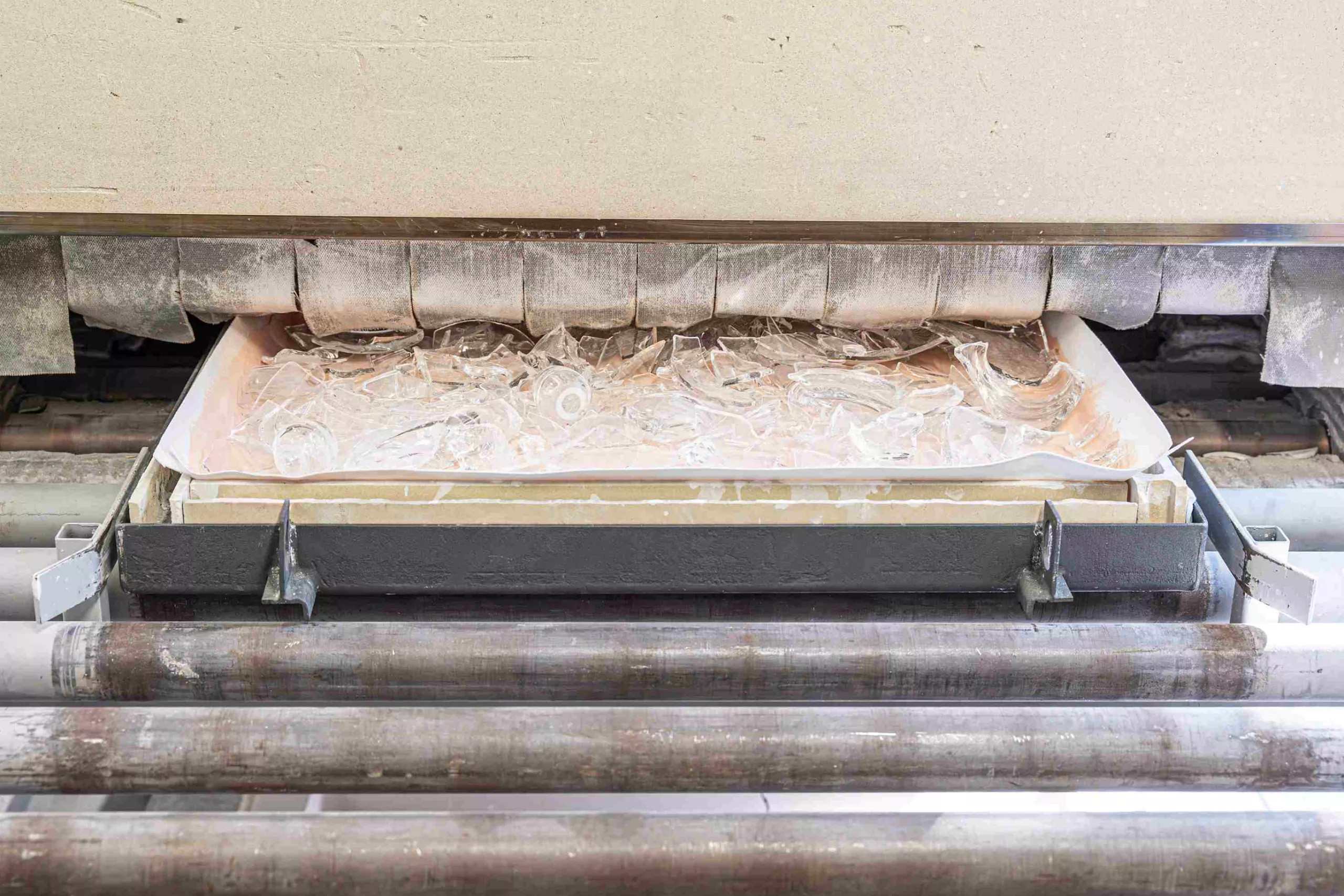 The robust BEACON light installation is composed of 292 BROKISGLASS segments, created through the recycling of waste glass from the Janštejn Glassworks. The recycling process begins with hand blown glass, during the production of which up to 30% of high-quality glass material is discarded as waste. At Janštejn Glasswork, however, these glass shards are then recycled in a fusing kiln, where they are cut using a water jet and shaped into a decorative pattern reminiscent of wood grain texture.Explore the production process of the glass components used in the BEACON installation in the following photographs.
