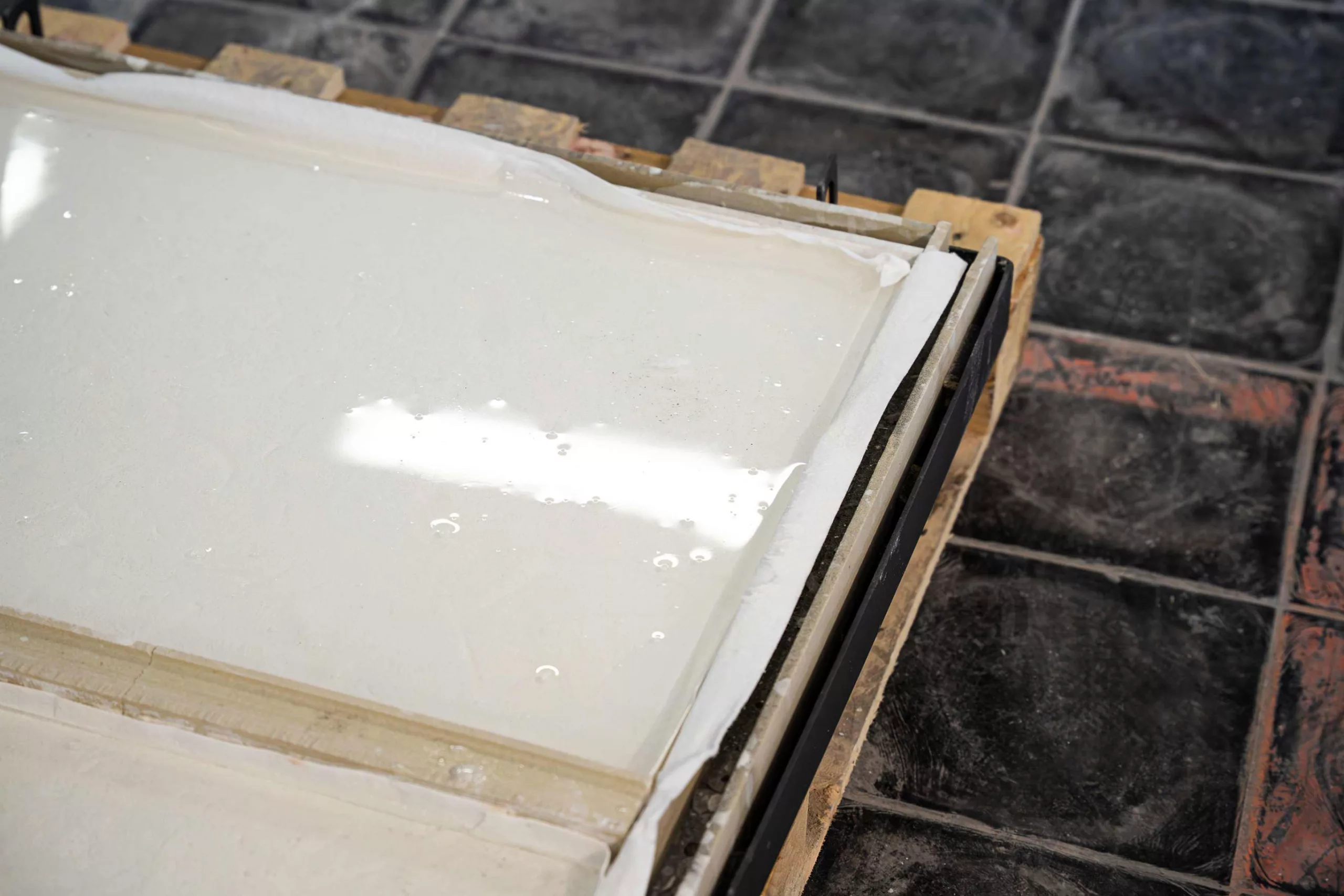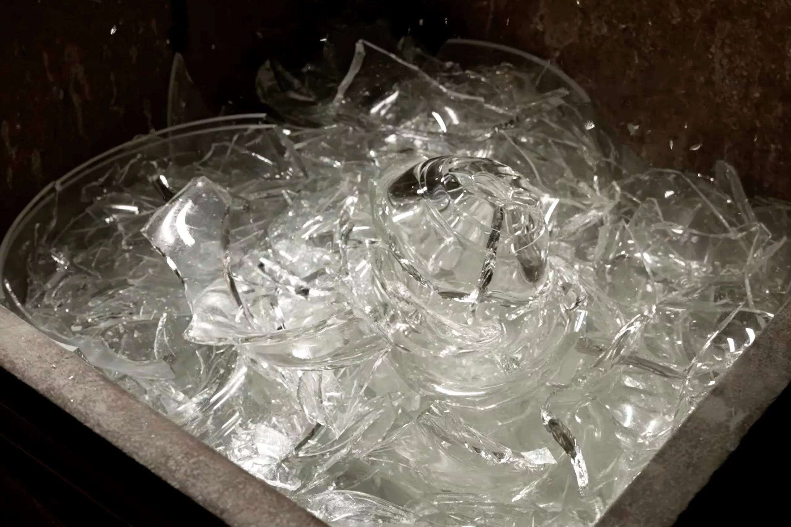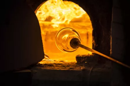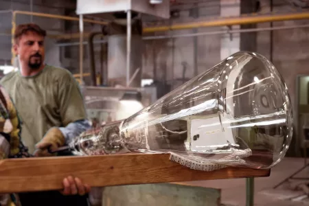 The robust BEACON light installation is composed of 292 BROKISGLASS segments, created through the recycling of waste glass from the Janštejn Glassworks. The recycling process begins with hand blown glass, during the production of which up to 30% of high-quality glass material is discarded as waste. At Janštejn Glasswork, however, these glass shards are then recycled in a fusing kiln, where they are cut using a water jet and shaped into a decorative pattern reminiscent of wood grain texture.Explore the production process of the glass components used in the BEACON installation in the following photographs.