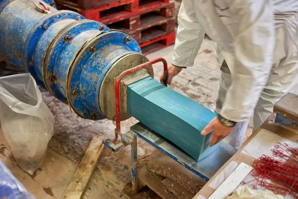 The development of the process grew out of research into historic encaustic tile clay recipes and the invention of a modern equivalent, which is slip resistant and vitrifies at a low temperature, meaning less energy is used in its production. Different colours are created by adding minerals such as iron and cobalt to the base recipe. Blocks of each colour are marbled together by hand before being sliced and pressed into tile shape.