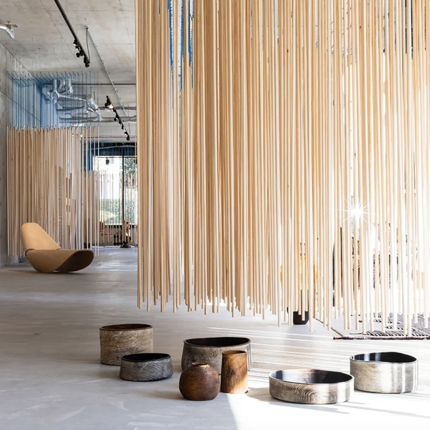 At the end of the pop up Matter of Stuff kept the wooden dowels to be repurposed for a new exhibition during London Design Festival 2019 at Sketch London, 'A Second Life'