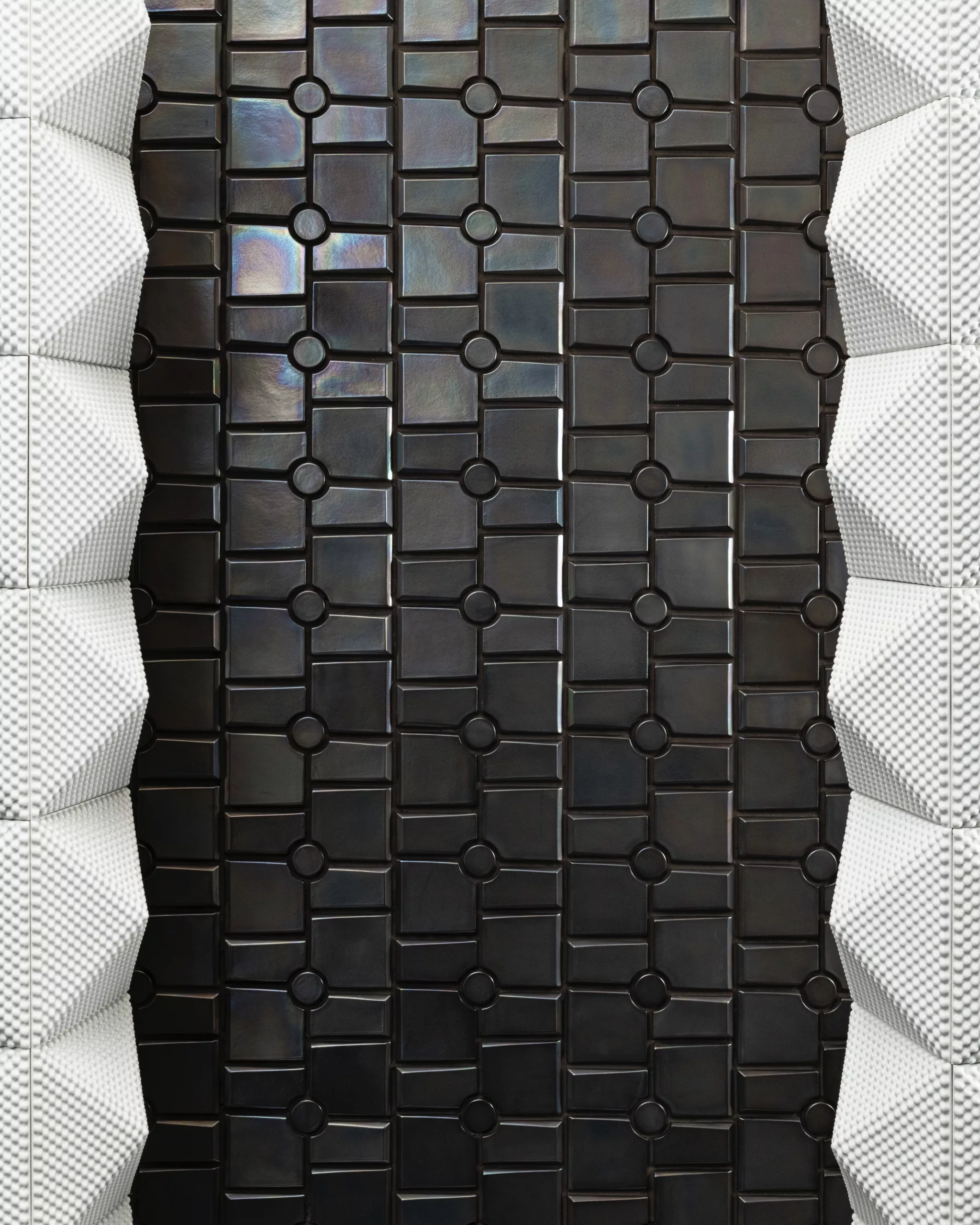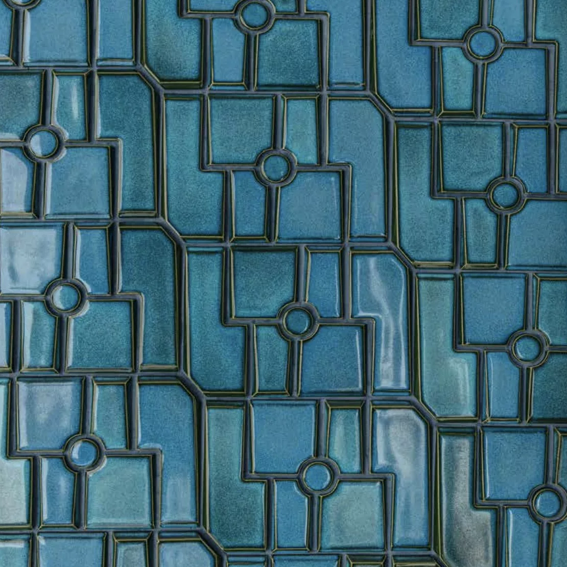 Each three-dimensional tile features a subtle irregularity that enhances color shading and reflects light dynamically, emphasising the collection’s depth and material richness. The color palette includes tones that harmonise or contrast, some with iridescent finishes, interacting with both the tiles and the spaces between them. Designed for indoor and outdoor use.