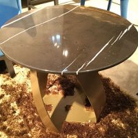 The echo table pushes the material limits of metal and wood to imagine an intangible reality. The grain of wood tells its history, and by using a technique of exposing the hardwood (winter season) and embedded metal into the lines of the softwood (summer season), each growth creates an elusive boundary between the two materials. The objectivity further enhanced by the lightness and thinness in the profile of both materials. Beauty and inspiration are found all around us. The table legs reference the shape generated by the spilling of water. The variation in the shapes of the table top resembles that of stones organically formed by sea current. Enacting the activity and motion which would happen around a table. The colours allude to the subtle shades of a sunrise, created in three types of metal: aluminium, copper, and brass. Developed and produced during the Materials Assemble Designer Residency program in Montalcino.