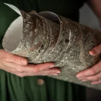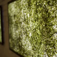 This product is a lightweight sheet made of plant mesh, paired with an environmentally friendly, water-based adhesive, providing tactile and visually engaging surfaces. This is the basis of all Viaplant materials. Use and applications include lighting, wall coverings, kitchen splashbacks, room dividers, railings, furniture, objects, and accessories. Available finishes include glass surface with glossy finish, textile with natural finish, wallpaper with matt or glossy finish, and cast with matt or glossy finish.