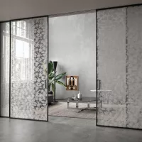 Our product features a customizable decorative colouring that enhances graphic or photographic images with a striking visual impact. It is applied to laminated glass, available in both transparent and satin finishes, through a unique printing process utilising special colour pigments. The timeless, sophisticated, and genuine character of glass is married with cutting-edge graphic design, propelling it into a contemporary realm. The glass panels are flawlessly consistent, boasting colours that remain vibrant and unchanged over time, embodying expansive creative potential. From refined textures and vividly coloured designs that showcase individuality, to the interplay of contrasts between matte and gloss finishes across various models, this collection introduces a suite of singular door designs. Employing a modern, adaptable, and engaging method, this technique sets the glass apart, making it communicative and vibrant, and opens up novel application possibilities in interior design and architecture.